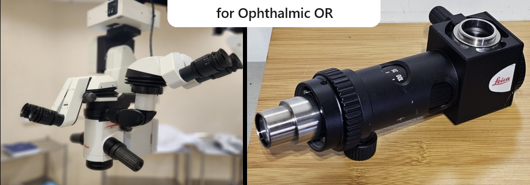 Please take a picture of the microscope, beam-splitter & beam-splitter video component (if present). One goal here is to identify the make and model of the ocular system (eg, Zeiss Artevo-800). The items to photograph will look something like this: