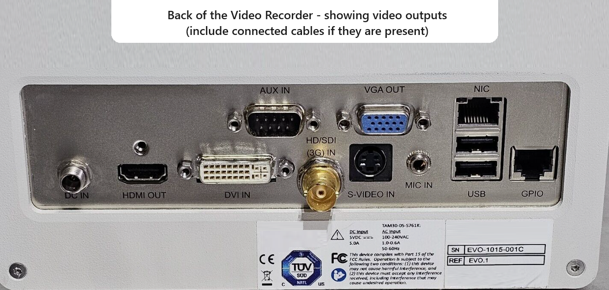 If there is a video DISPLAY showing the output of the microscope, take a photo of the front and back the display. If there is a VIDEO RECORDER used, please photograph the front and back of that, mostly to show the connections that are available.